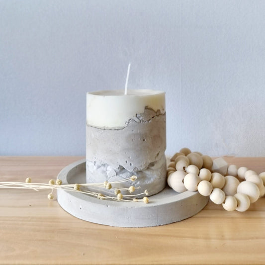 Set de Velas (6 cm, 10 cm, 13 cm) + Bandeja decorativa de Cemento Redonda