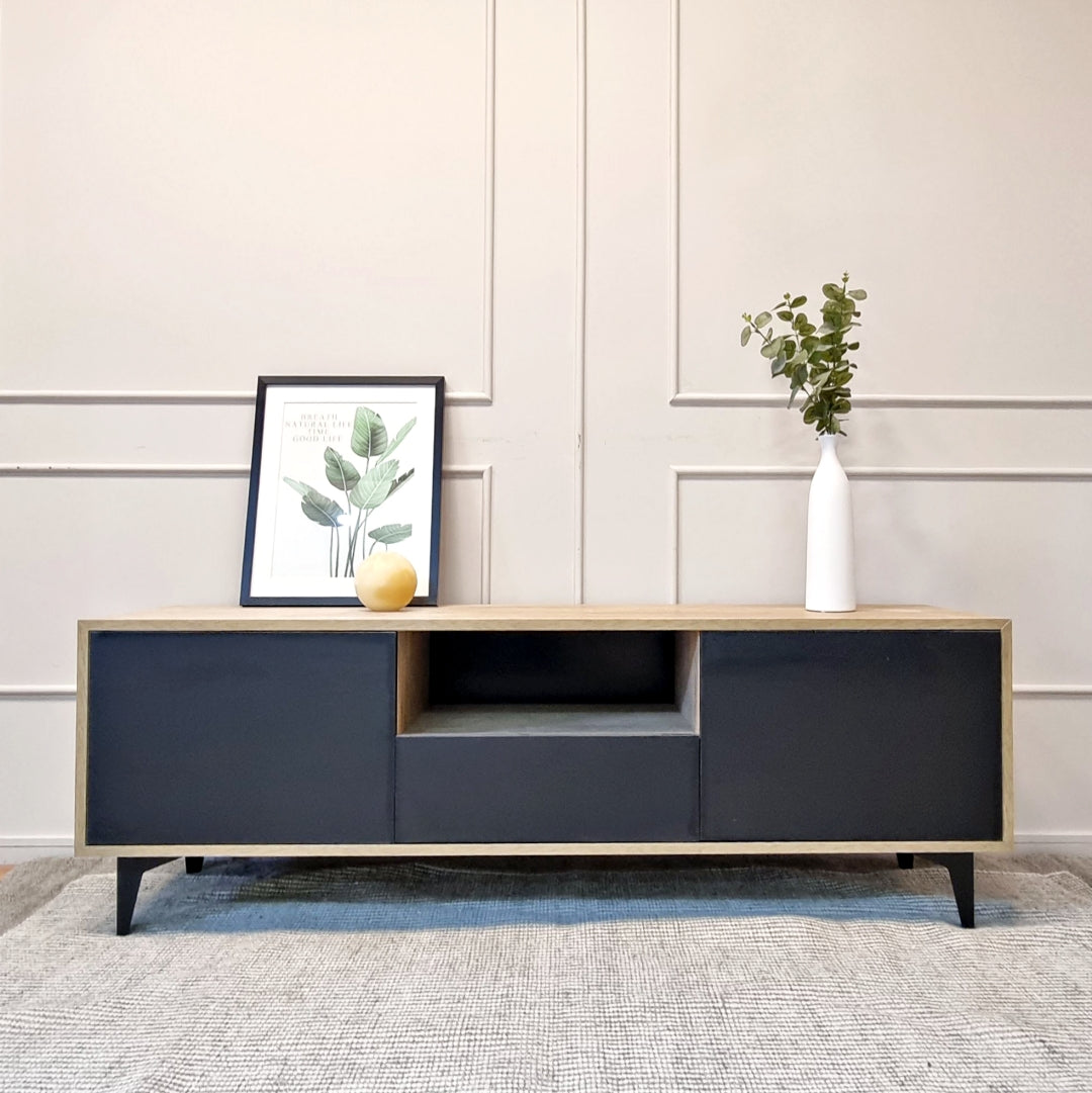 Destaca por los detalles en sus acabados como sus uniones, las vetas de sus puertas, sus patas estilizadas. Está fabricado 100% Mano en melamina y con patas de fierro electropintadas, diseñadas y fabricadas por nosotros, por lo que este mueble es una pieza única y de altísima calidad.